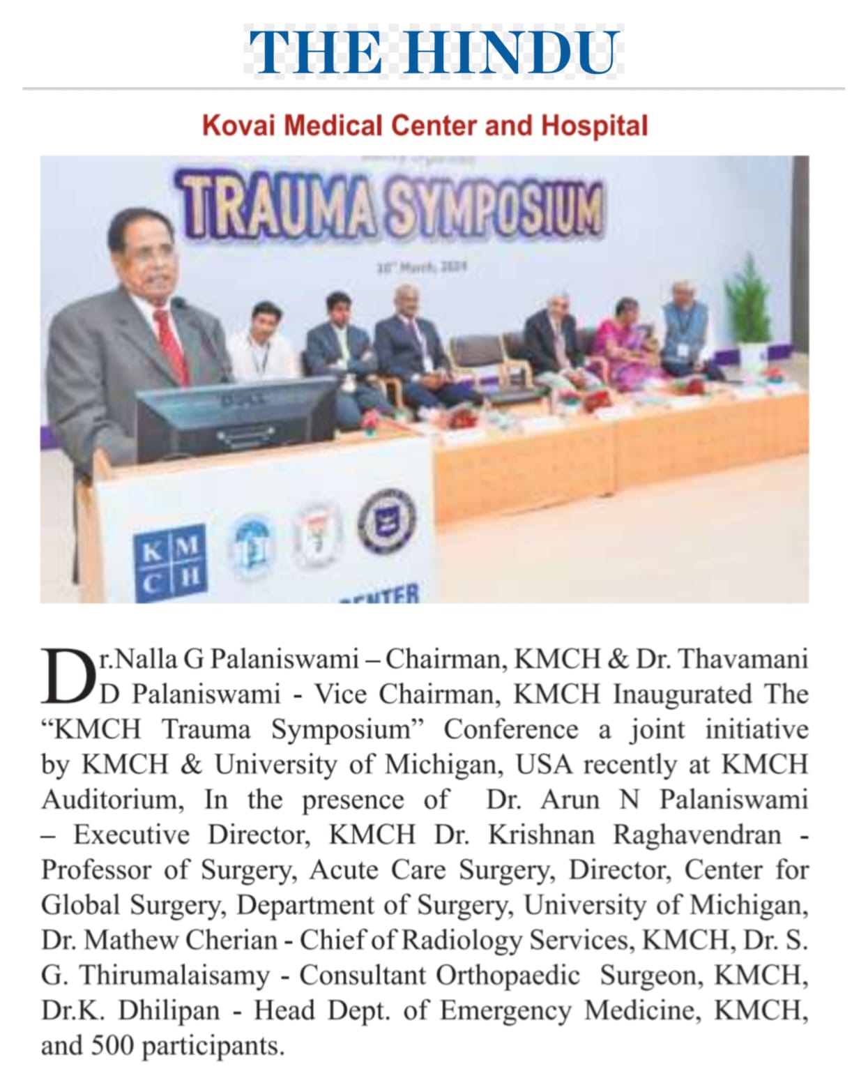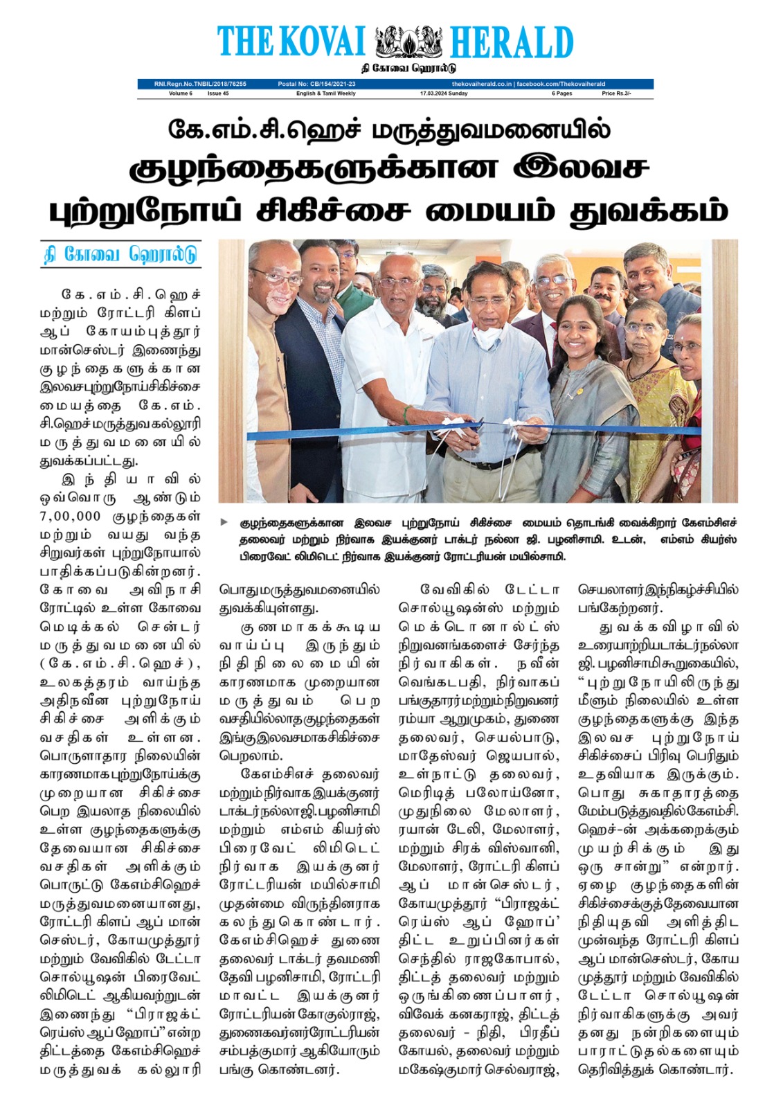 Press Clippings of "Dr. Nalla G Palaniswami, Chairman and Managing Director, KMCH inaugurated 'A Paediatric Oncology ward' On The Hospital Premises in Coimbatore " appeared in the following news journals.