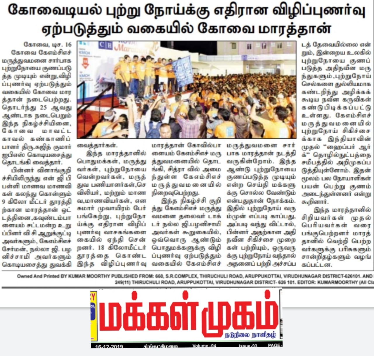 Press Clippings of “KMCH Cancer Awareness Marathon” appeared in the following news journals.