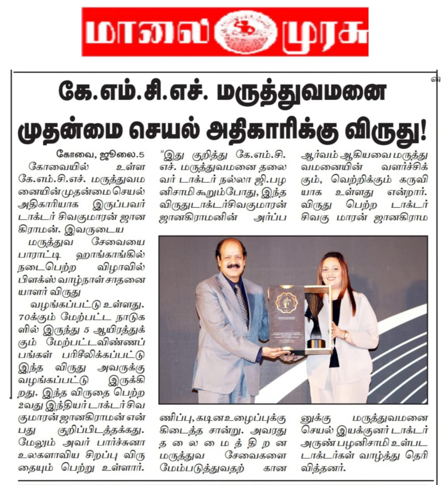 KMCH COO Honoured with Fluxx life time Achievement Award