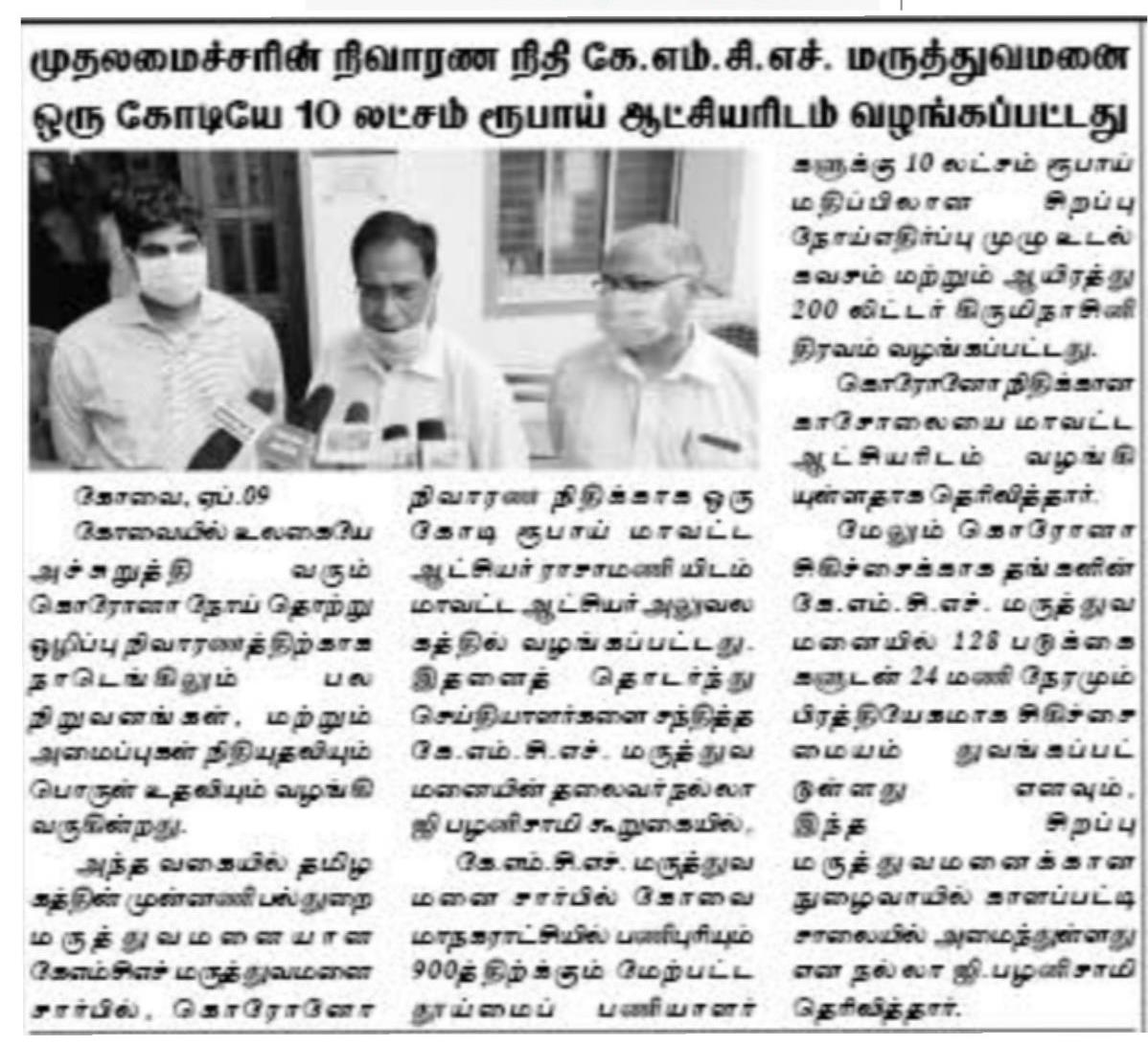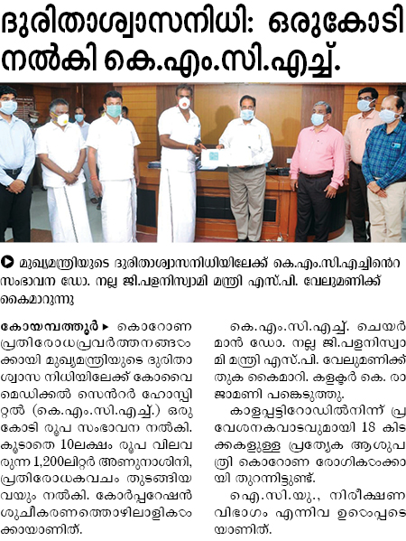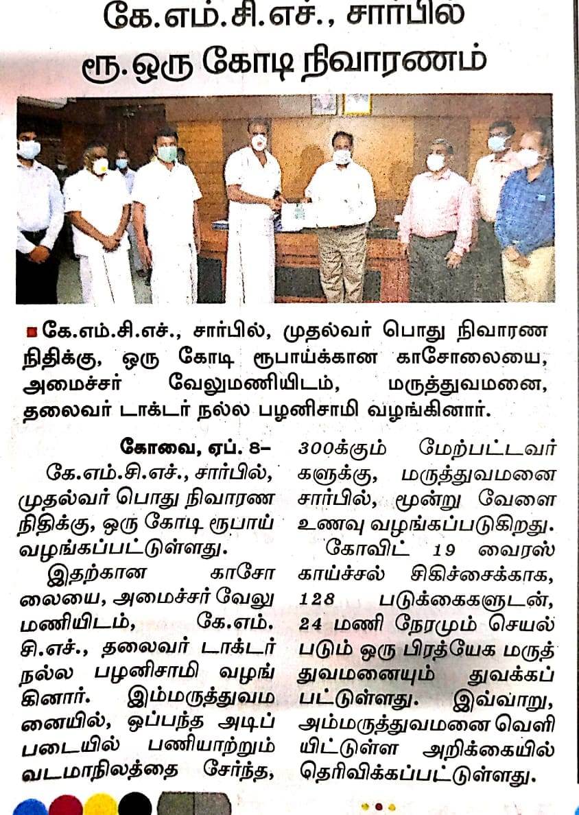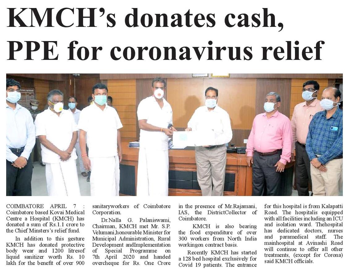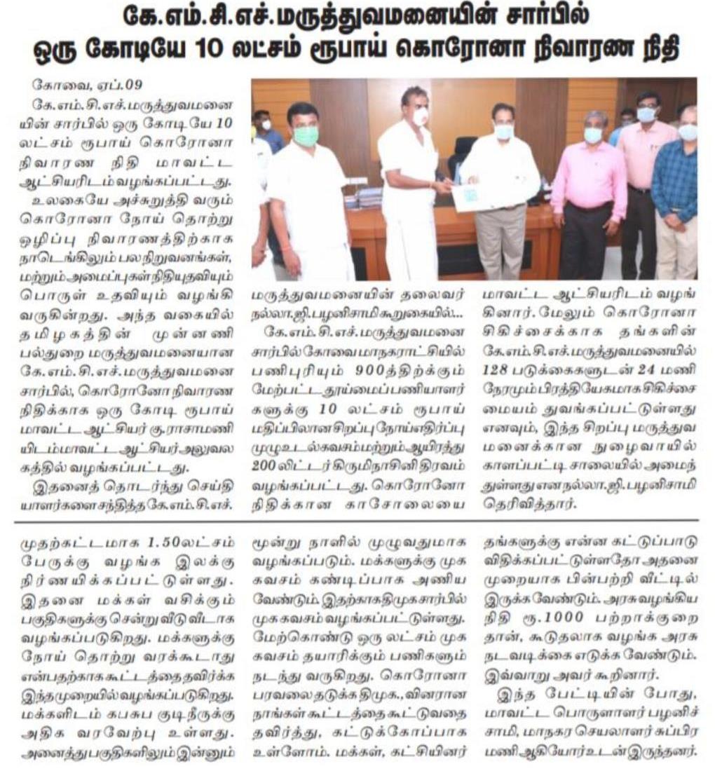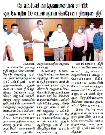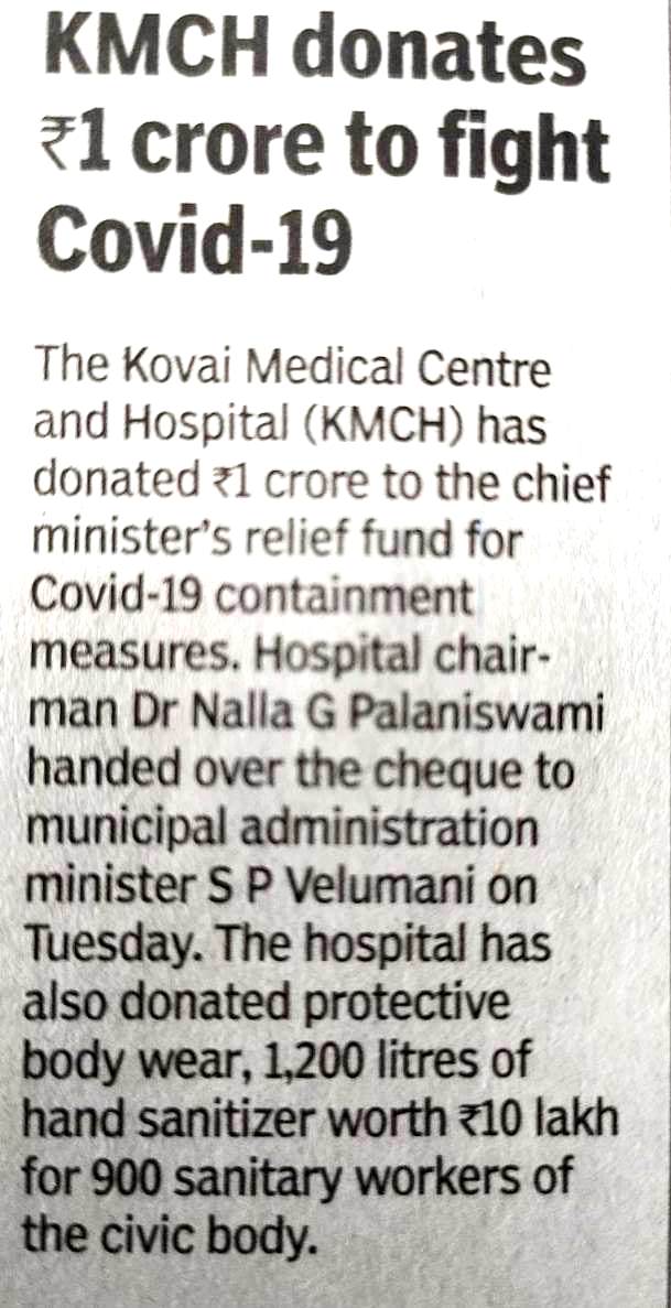Press Clippings of “KMCH donates Rs. One Crore Ten lakh for Corona Virus Relief” appeared in the following news journals.