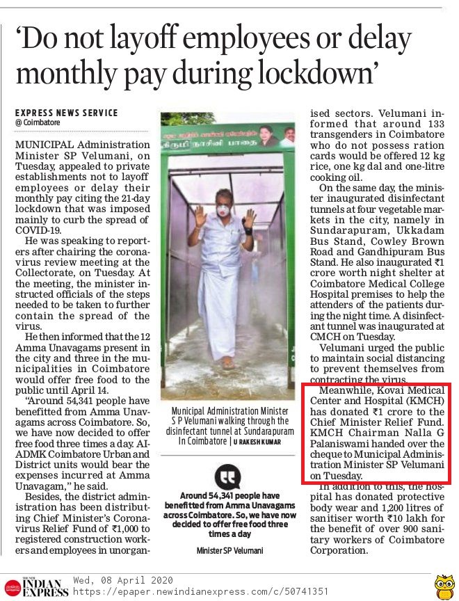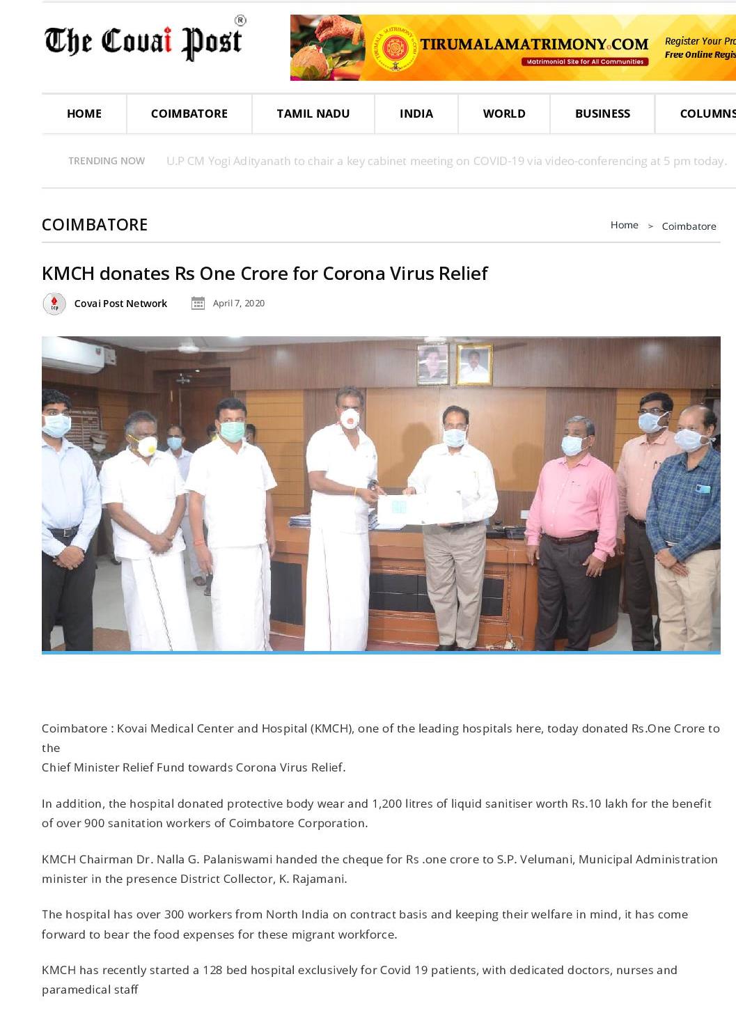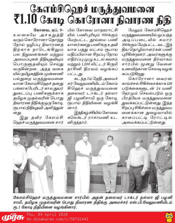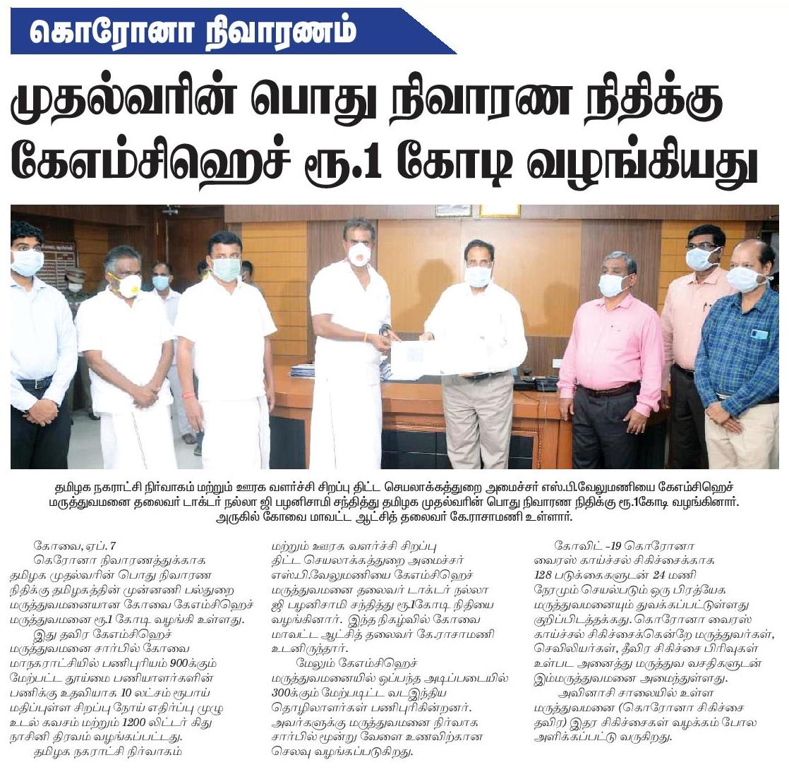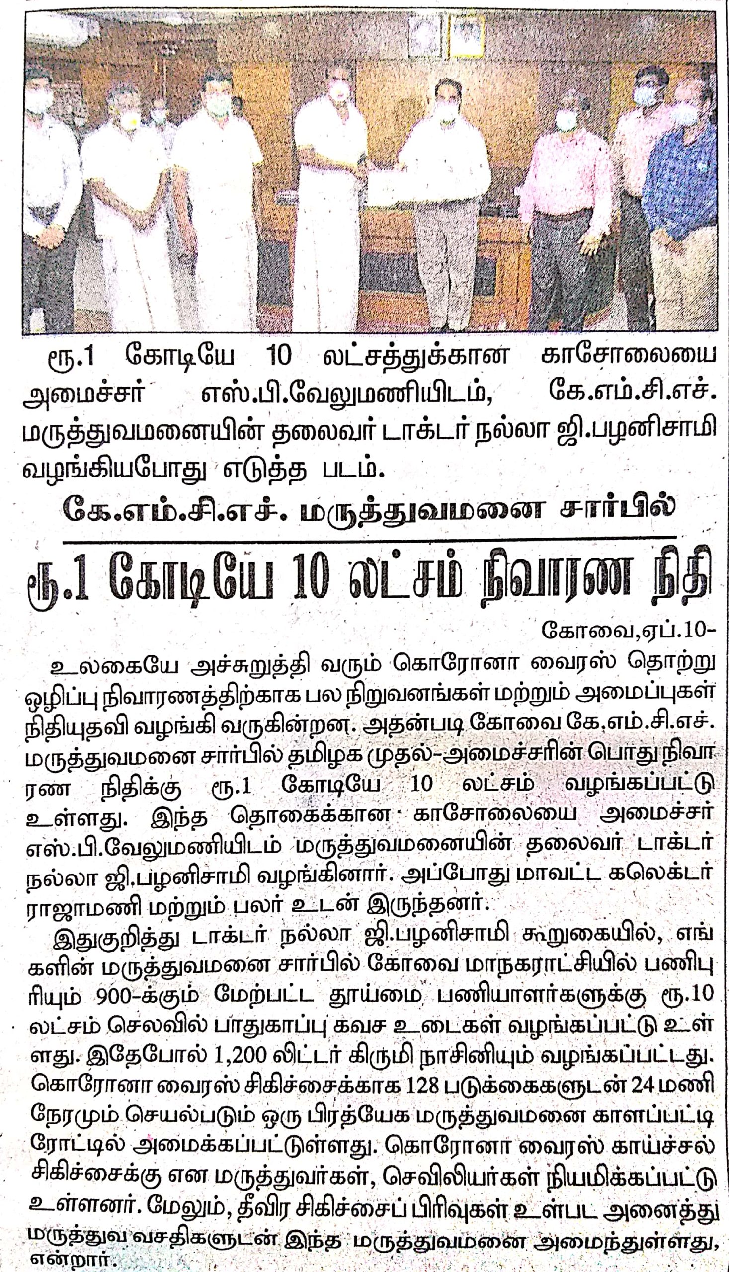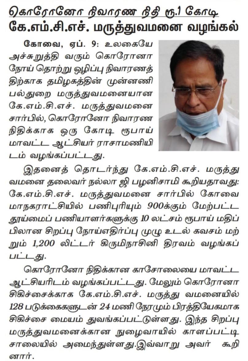 Press Clippings of “KMCH donates Rs. One Crore Ten lakh for Corona Virus Relief” appeared in the following news journals.