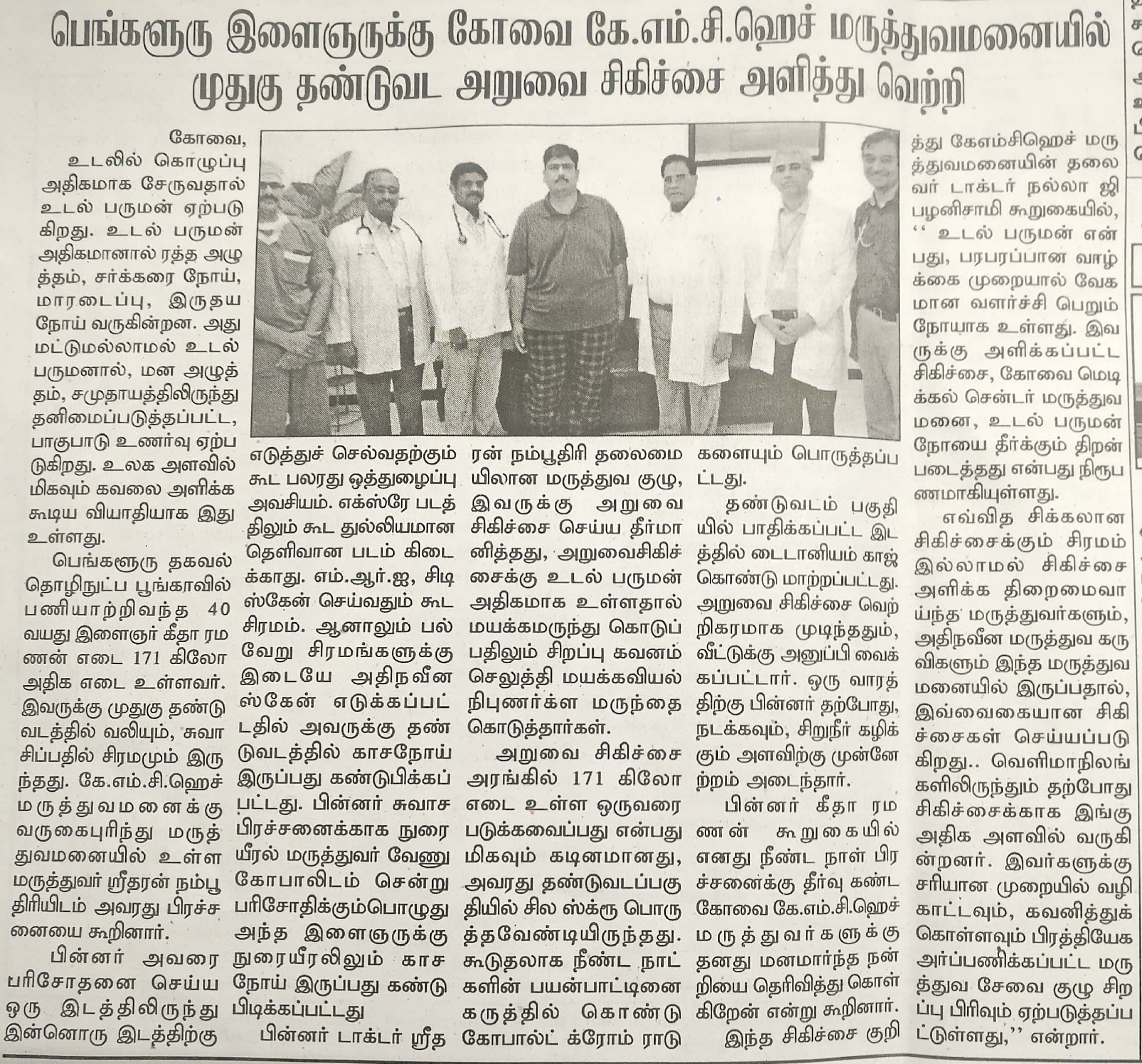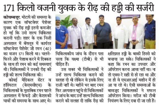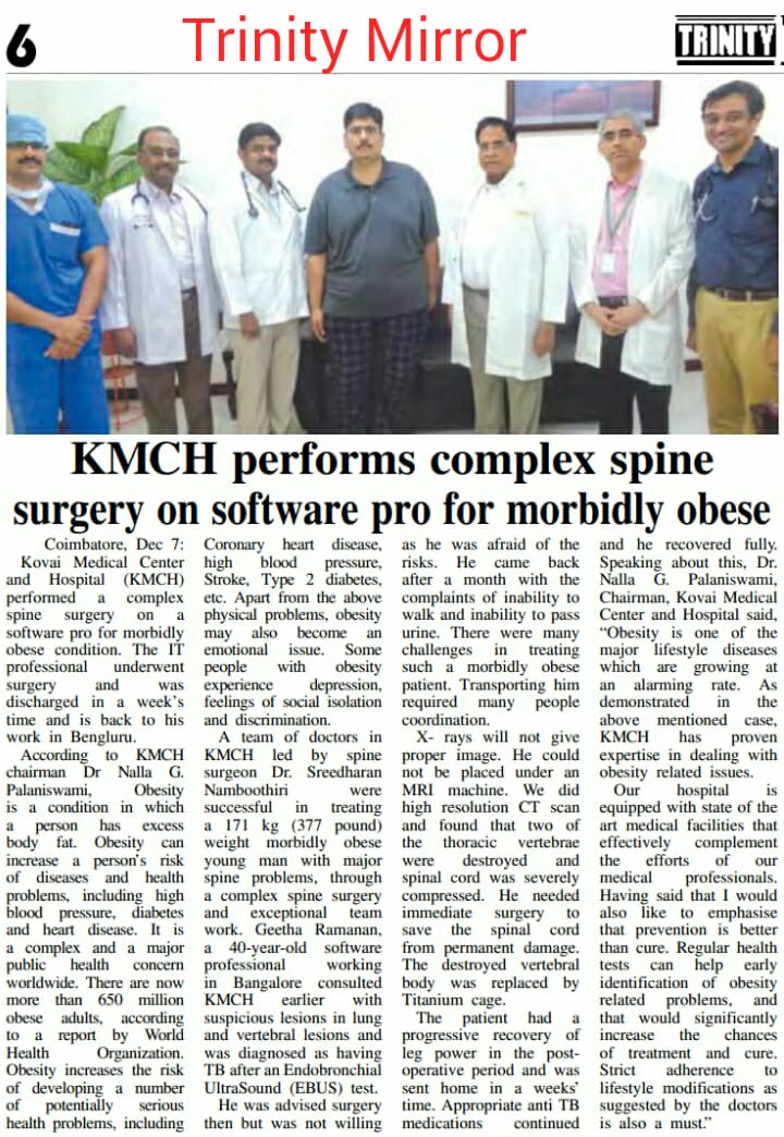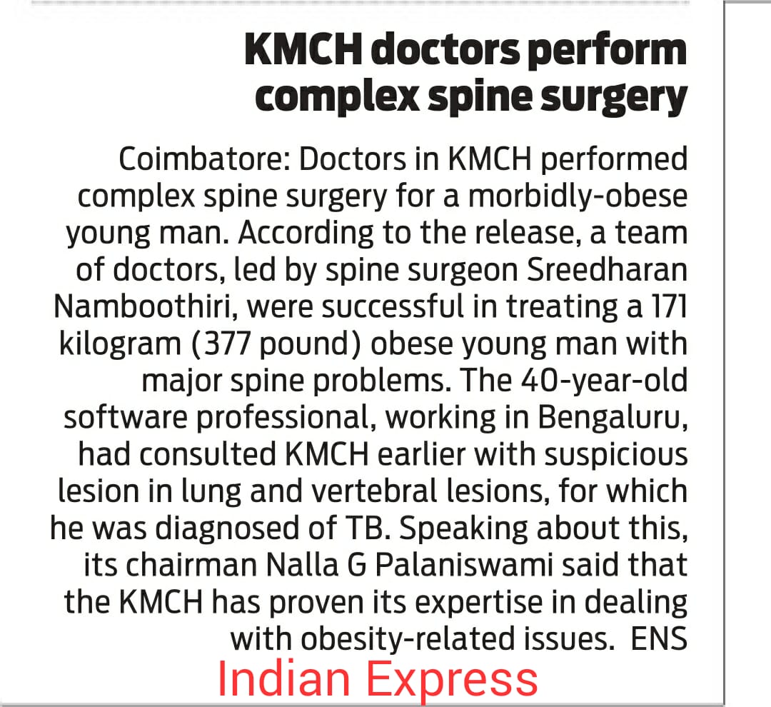 Press Clippings of “KMCH Performs Complex Spine Surgery, Successfully saves life of a young techie” appeared in the following news journals.