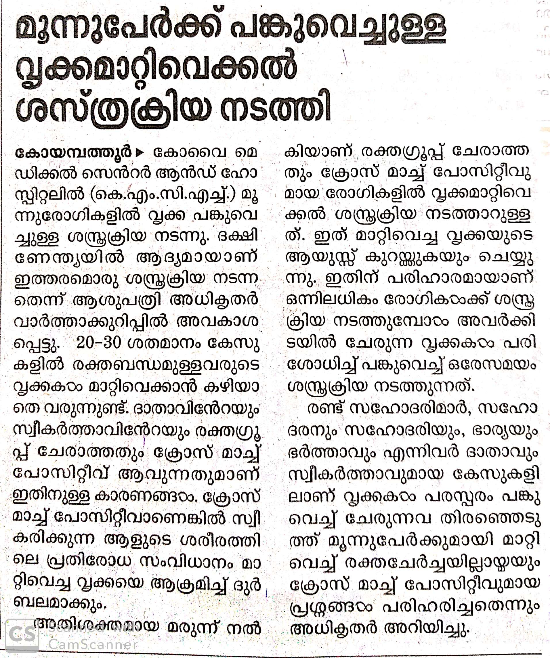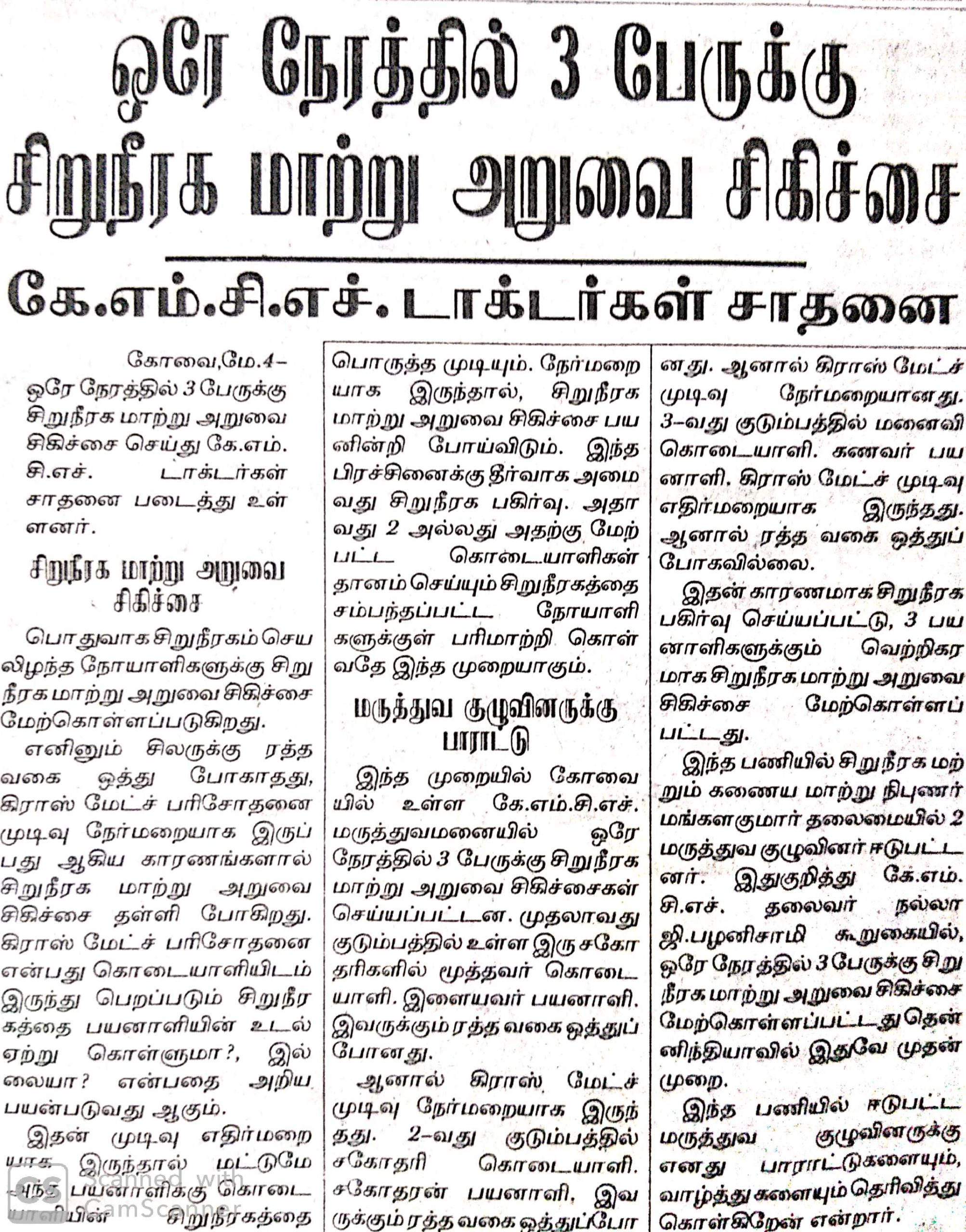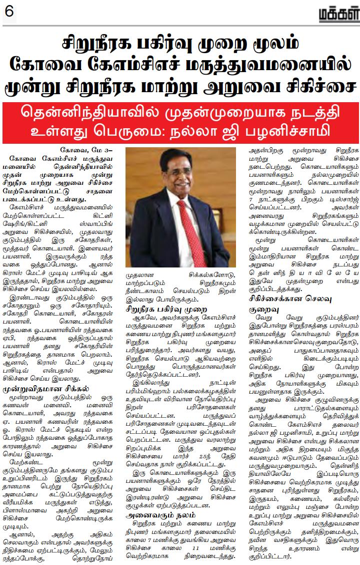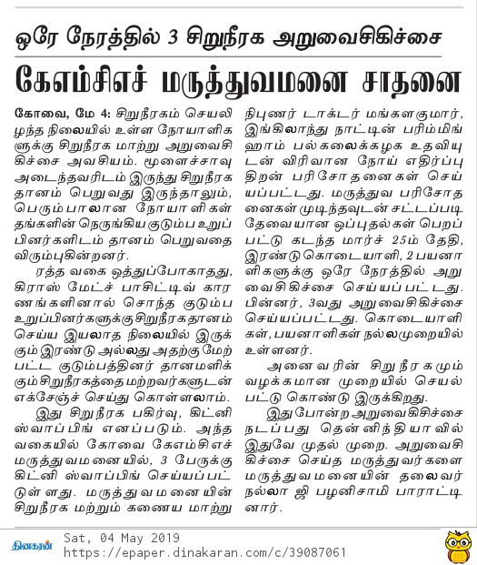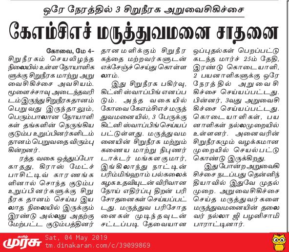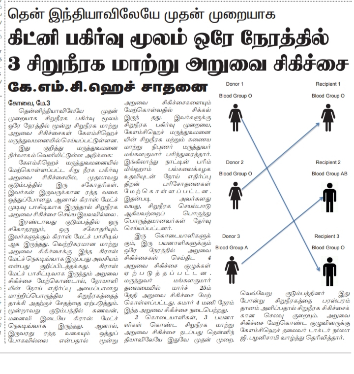 • Simultaneous three kidney transplant performed by KMCH